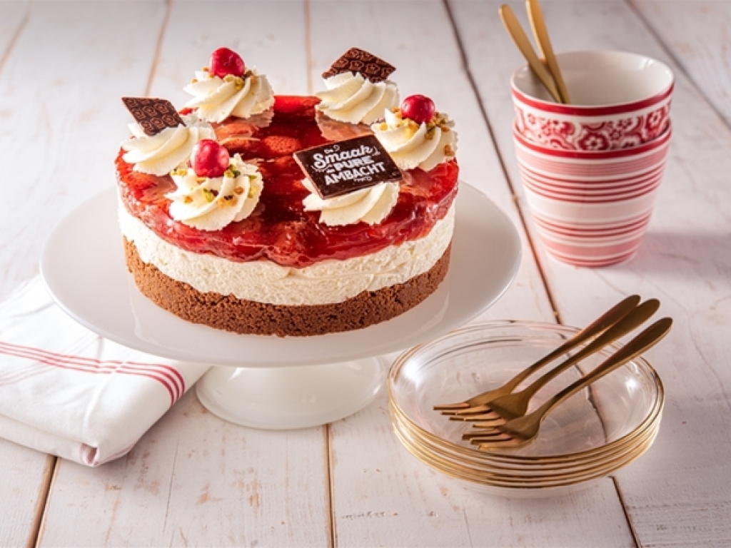 Bekende ouderwetse taart met een bodem van koekjes en gesmolten boter. Daarbovenop Monchou en een kersentopping. Afgewerkt met slagroom.