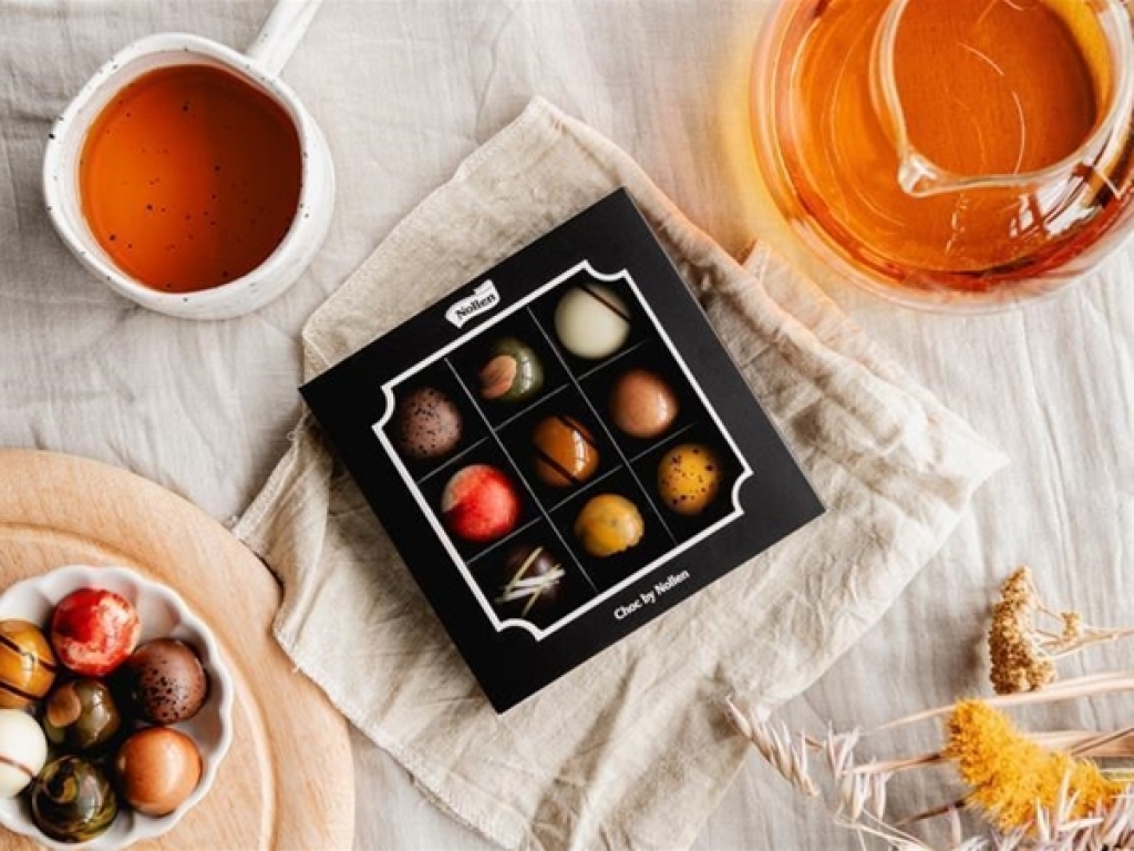 Een doosje bonbons gevuld met 9 heerlijke vormbonbons in de smaken karamel, vanille, passie, honing, pistache, koffie, framboos, pindakaas puur en amandel praline.